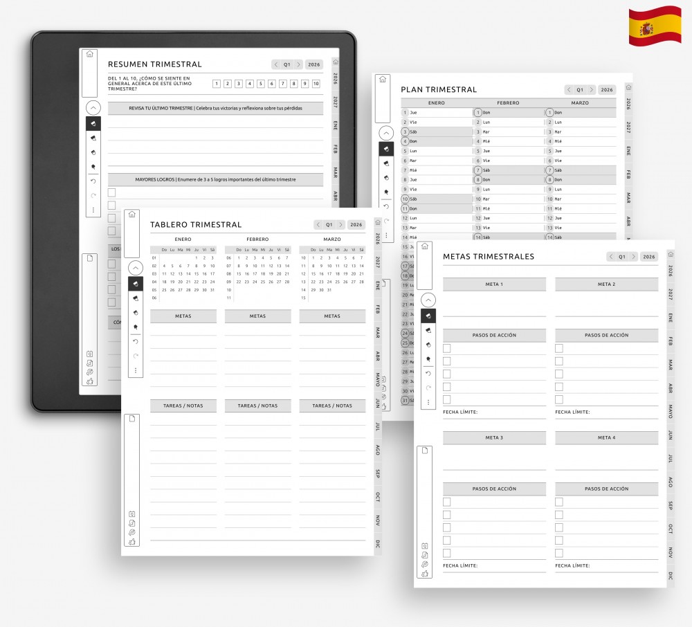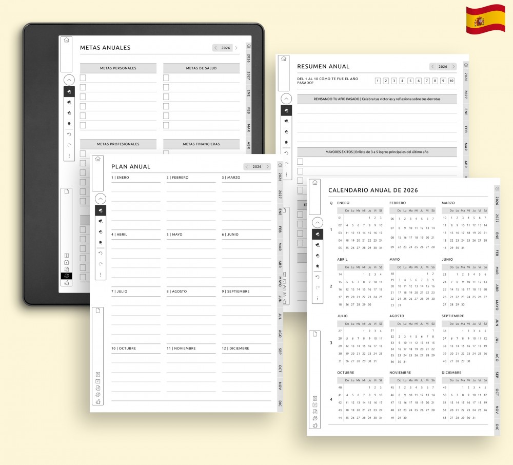 Comienza el año marcando objetivos, creando una visión general y organizando tu calendario. Estas cuatro páginas te ayudan a centrarte en lo esencial y mantener a la vista tus metas a largo plazo. Si lo deseas, puedes cambiar a cualquiera de los más de 40 diseños disponibles.