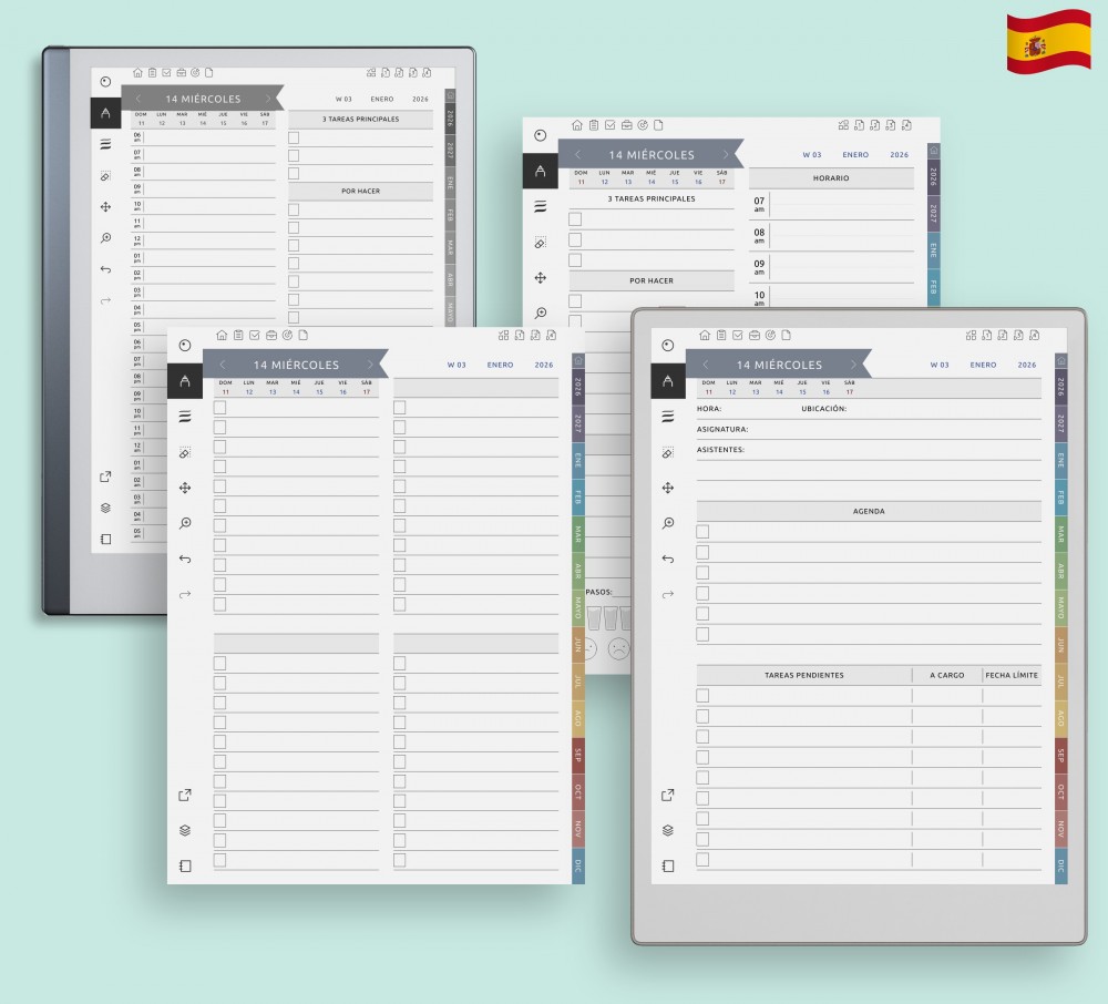 Incluye hasta cuatro páginas diarias, donde puedes elegir una plantilla de Notas de reunión diarias para cada una. Planifica tu día, registra ideas y mantén el ritmo de trabajo sin perder el hilo.
