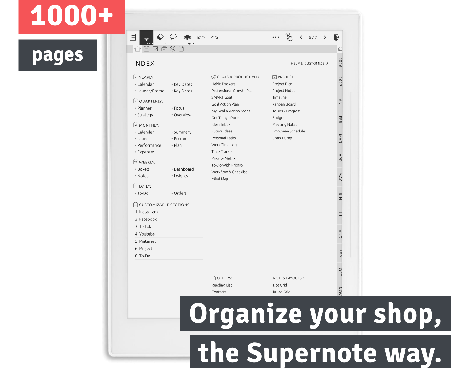 The Digital Shop Planner for Supernote is your complete business organizer, crafted for Etsy sellers, entrepreneurs, and small business owners. Designed to work seamlessly on Supernote’s paper-like surface, it helps you run your shop with focus and clarity, from fulfilling daily orders to preparing big campaigns.