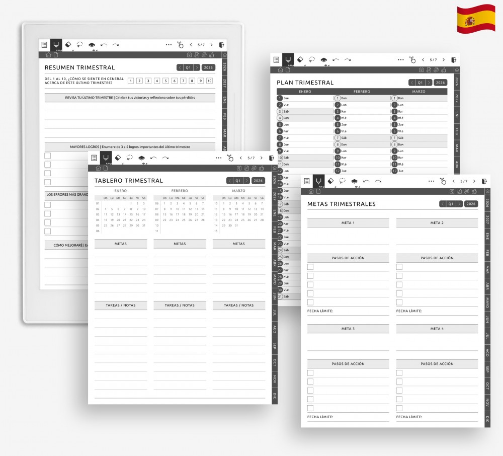 Planifica cada trimestre con diseños que te ayudan a fijar objetivos, revisar a medio plazo y reflexionar sobre cómo va todo. Estas cuatro páginas te dan estructura sin añadir estrés, y puedes sustituirlas por cualquiera de las más de 40 plantillas disponibles.