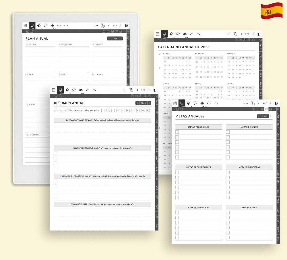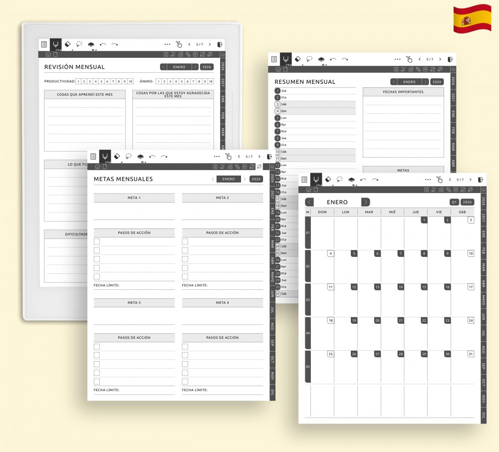 Utiliza los calendarios mensuales y las páginas de objetivos para mantener tu planificación clara y tus prioridades bien definidas. Estos cuatro diseños te ayudan a organizar fechas clave, fijar intenciones y revisar tu progreso. Puedes cambiar entre más de 50 plantillas según tus necesidades.